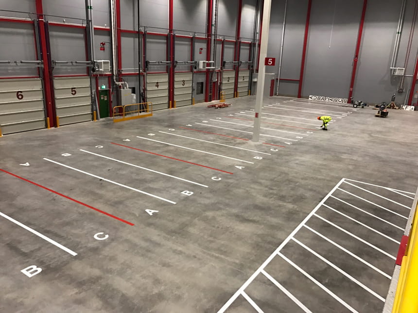 Utöver parkeringsplatser så målar vi alla förekommande linjer på industrigolv så som avspärrningar, ledlinjer för truckar och gående, uppställningsytor, övergångsställen etc.